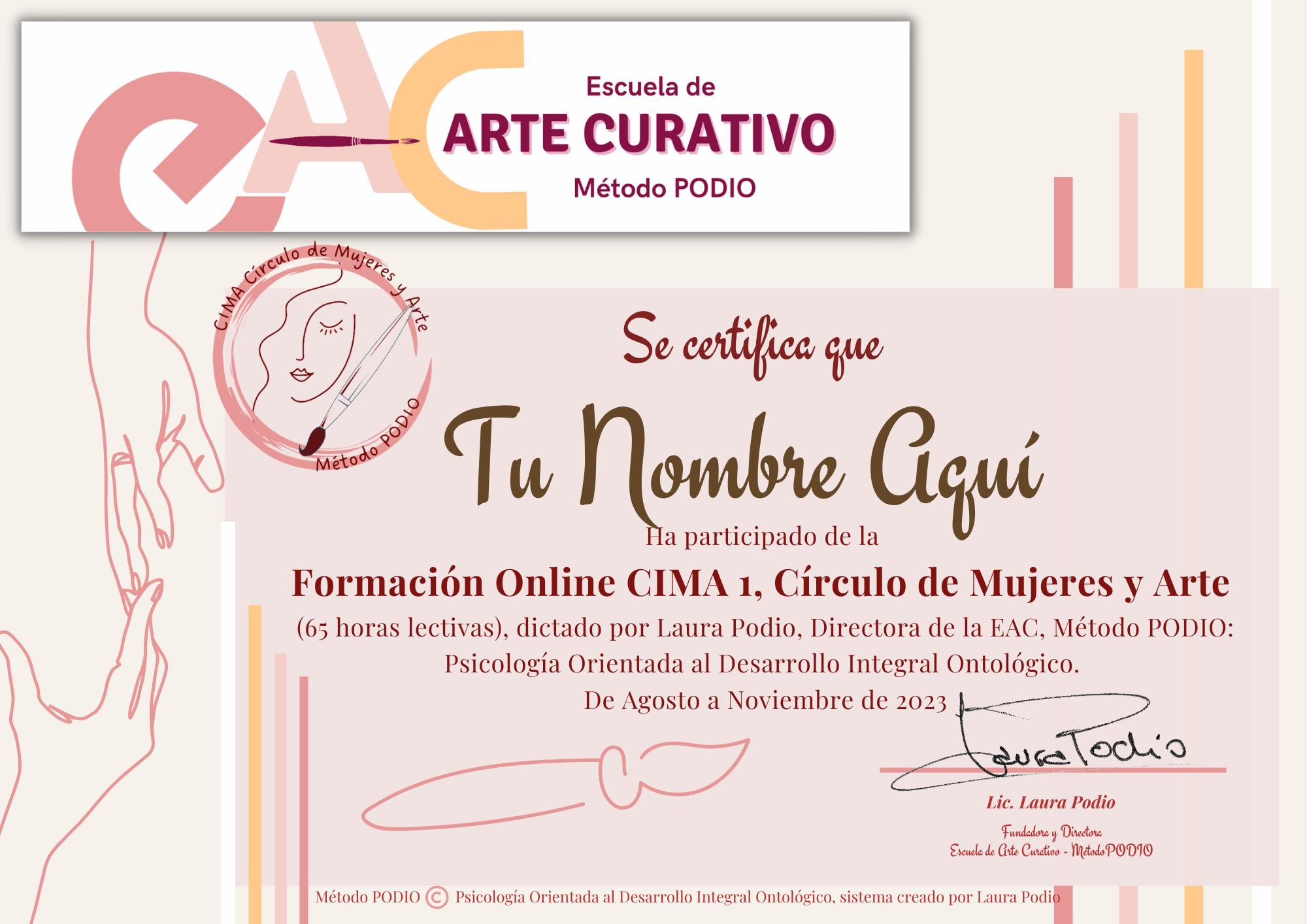 Soy Laura Podio, la apasionada creadora detrás de "CIMA, Círculo de Mujeres y Arte", y me llena de honor darte la más cálida bienvenida a esta experiencia única.
